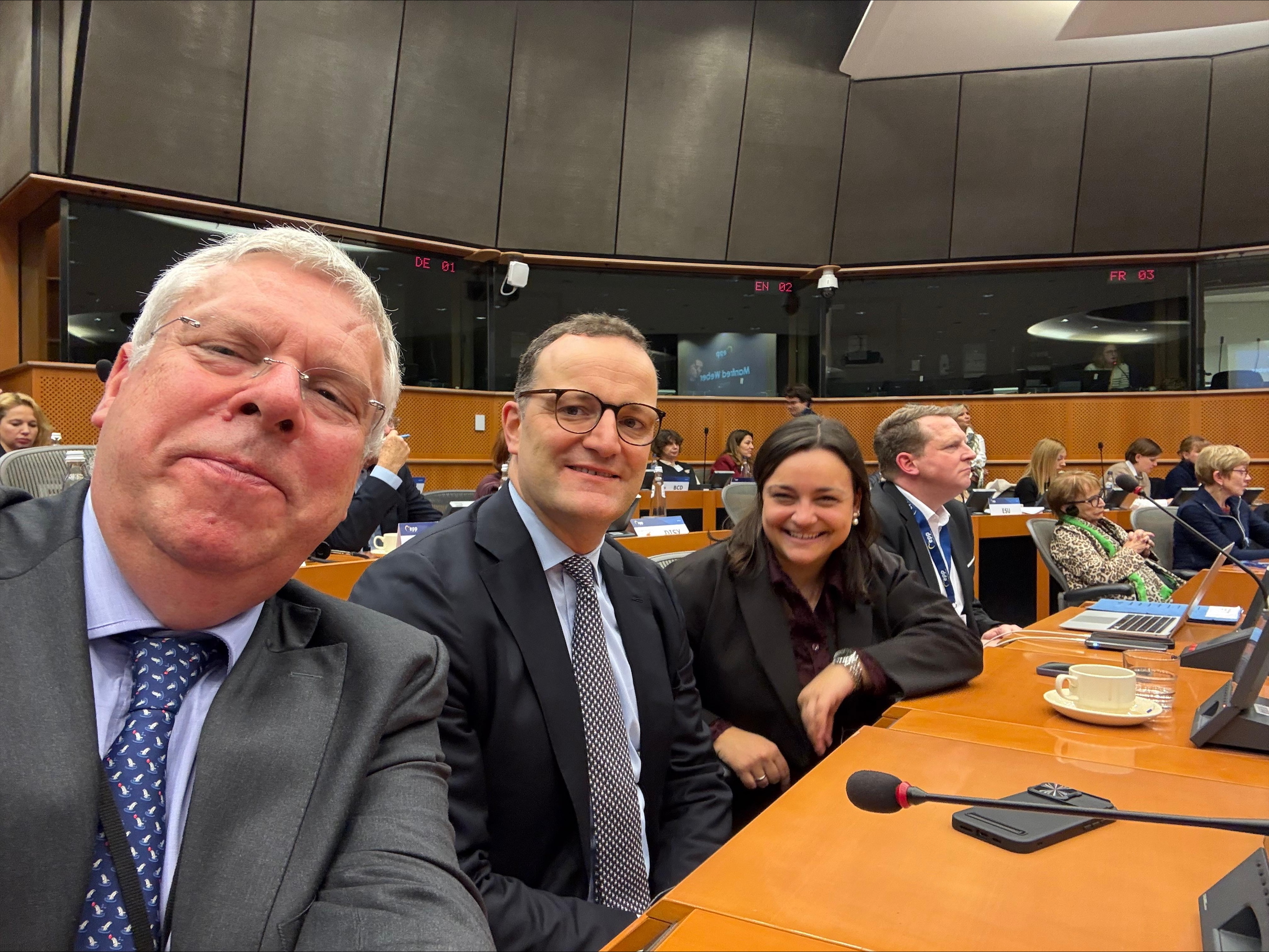 In der Sitzung der Political Assembly der EEP („Vorstand der Europäischen Volkspartei EVP") in Brüssel waren wir (im Bild: Catarina dos Santos, Jens Spahn und ich) gut vertreten. Auch im Europäischen Parlament geht es voran mit Reformen für die Wirtschaft. Aus für das generelle „Verbrenner-Aus". Noch in diesem Jahr Entschärfung der Lieferketten-Gesetzgebung und der Entwaldungsrichtlinie. David McAllister, Vorsitzender des Auswärtigen Ausschusses, EP-Parlamentspräsidentin Roberta Metsola und EVP-Präsident Manfred Weber bei der Sitzung. |